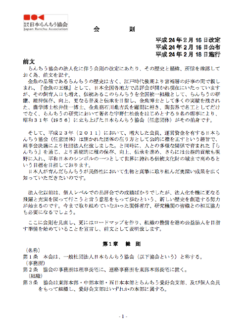 日本らんちう協会は、会員相互の親睦と融和をはかると共に、